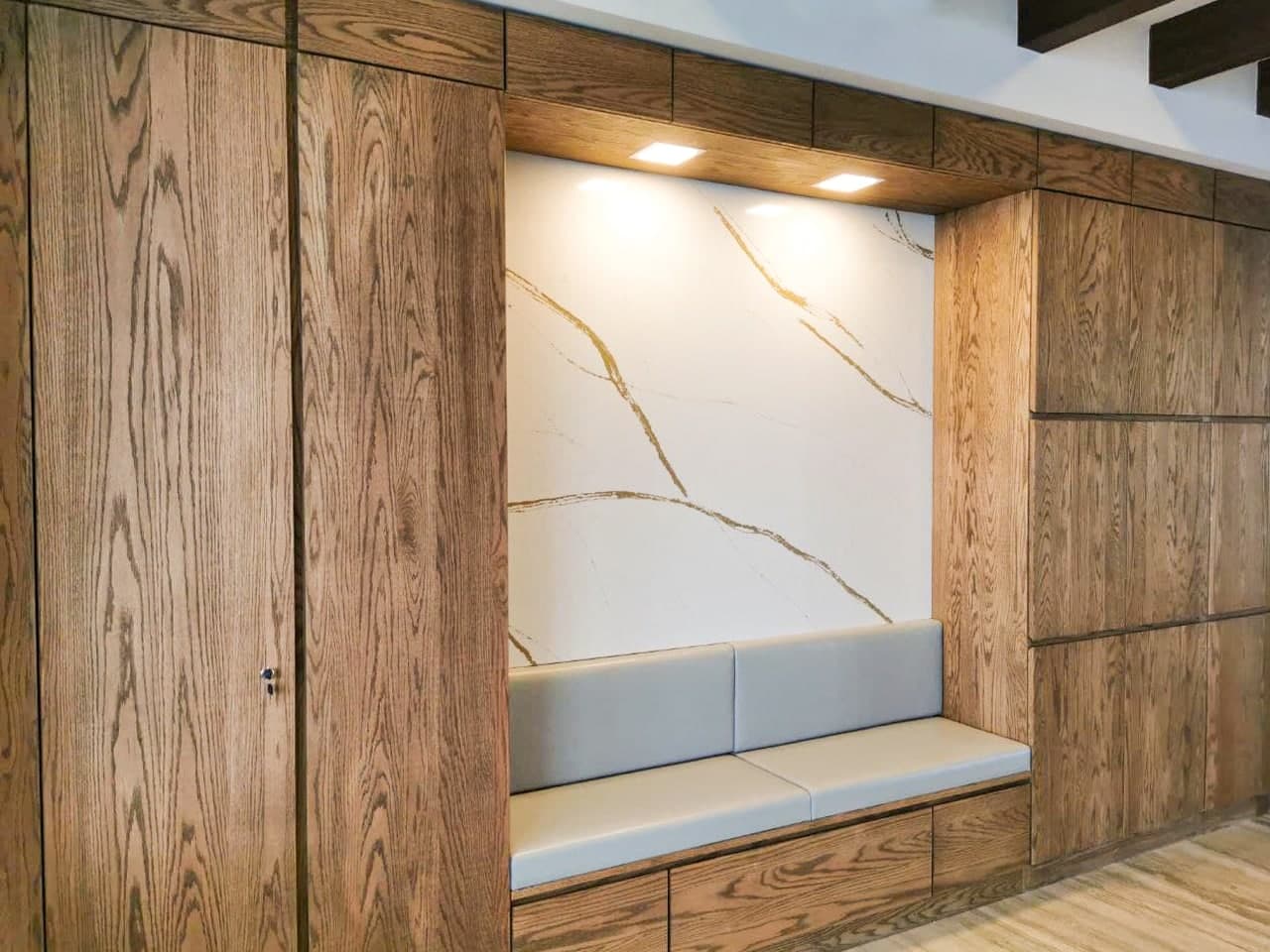 Oak was chosen for its timeless beauty, durability, and ability to exude warmth and elegance, enhancing the overall aesthetic of the space while ensuring longevity.