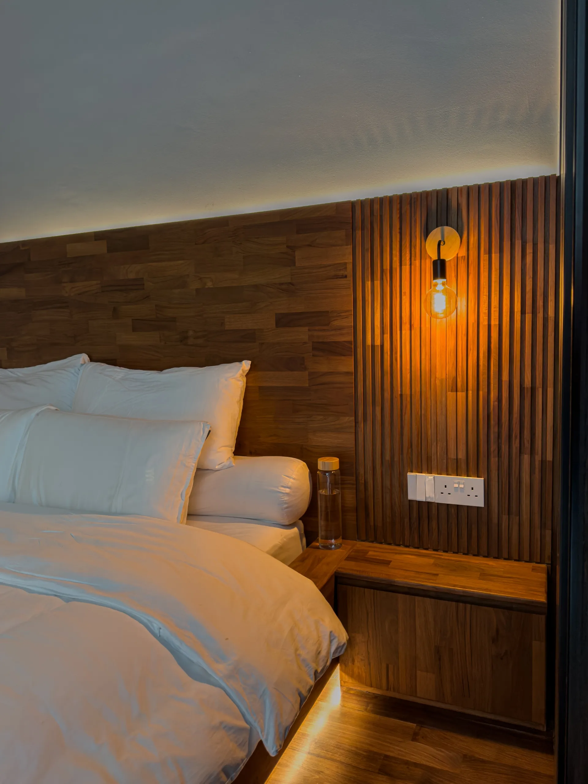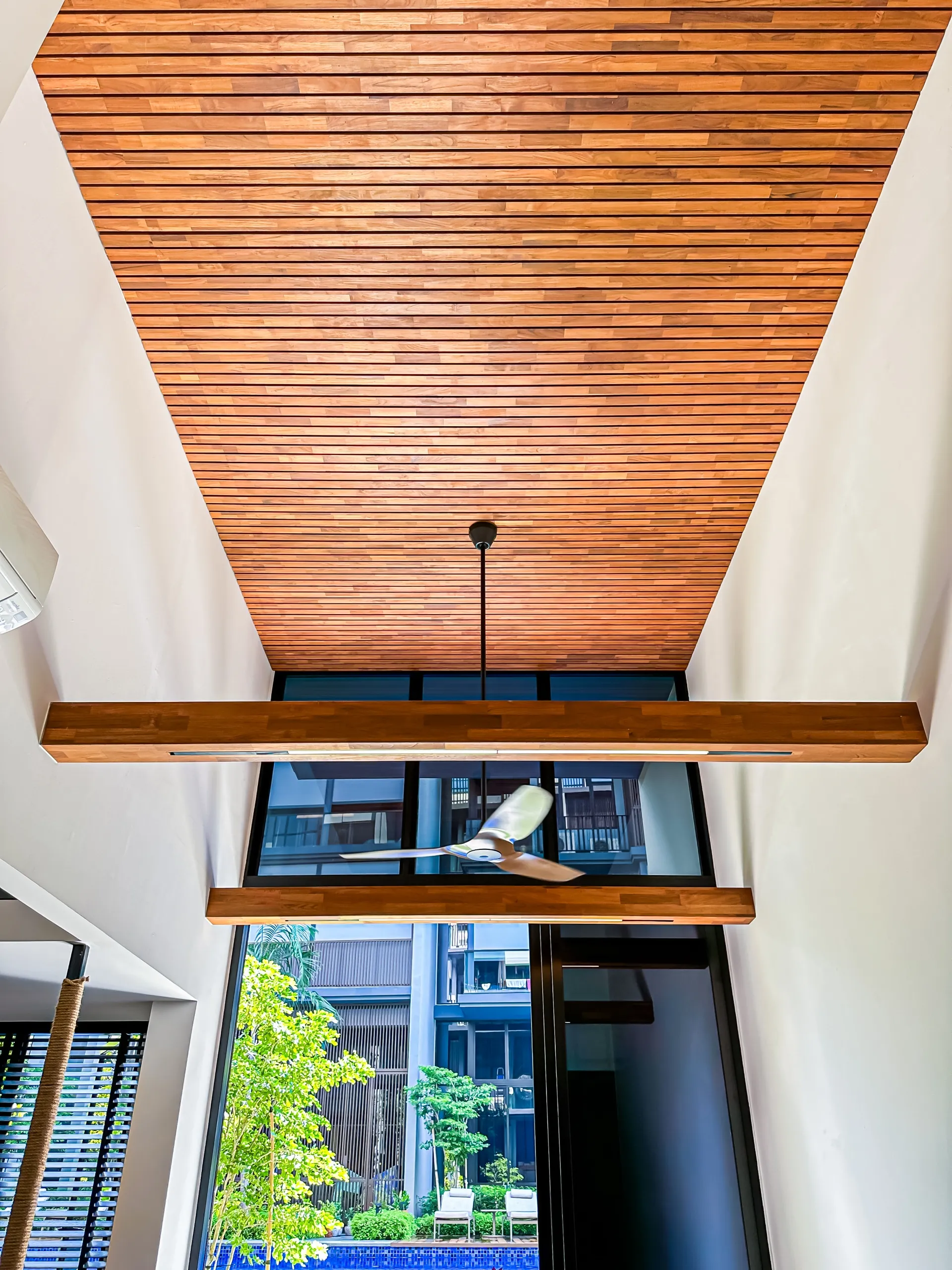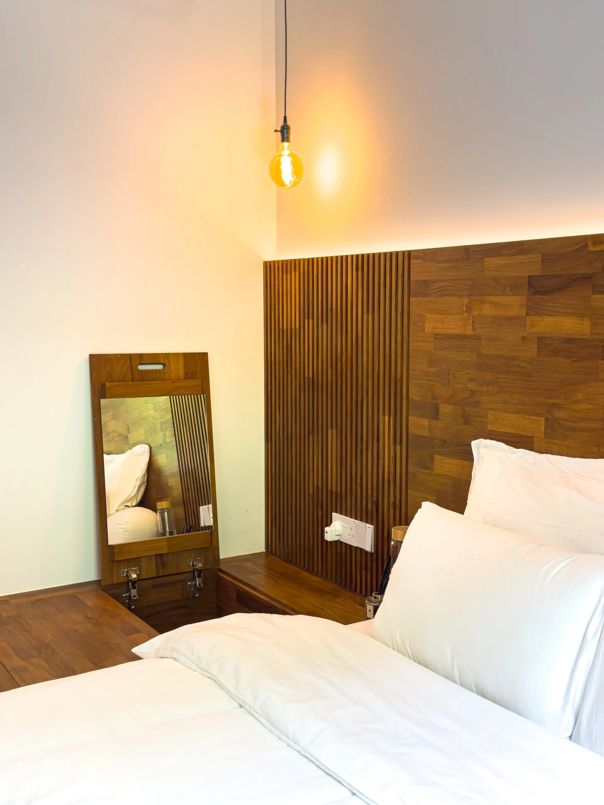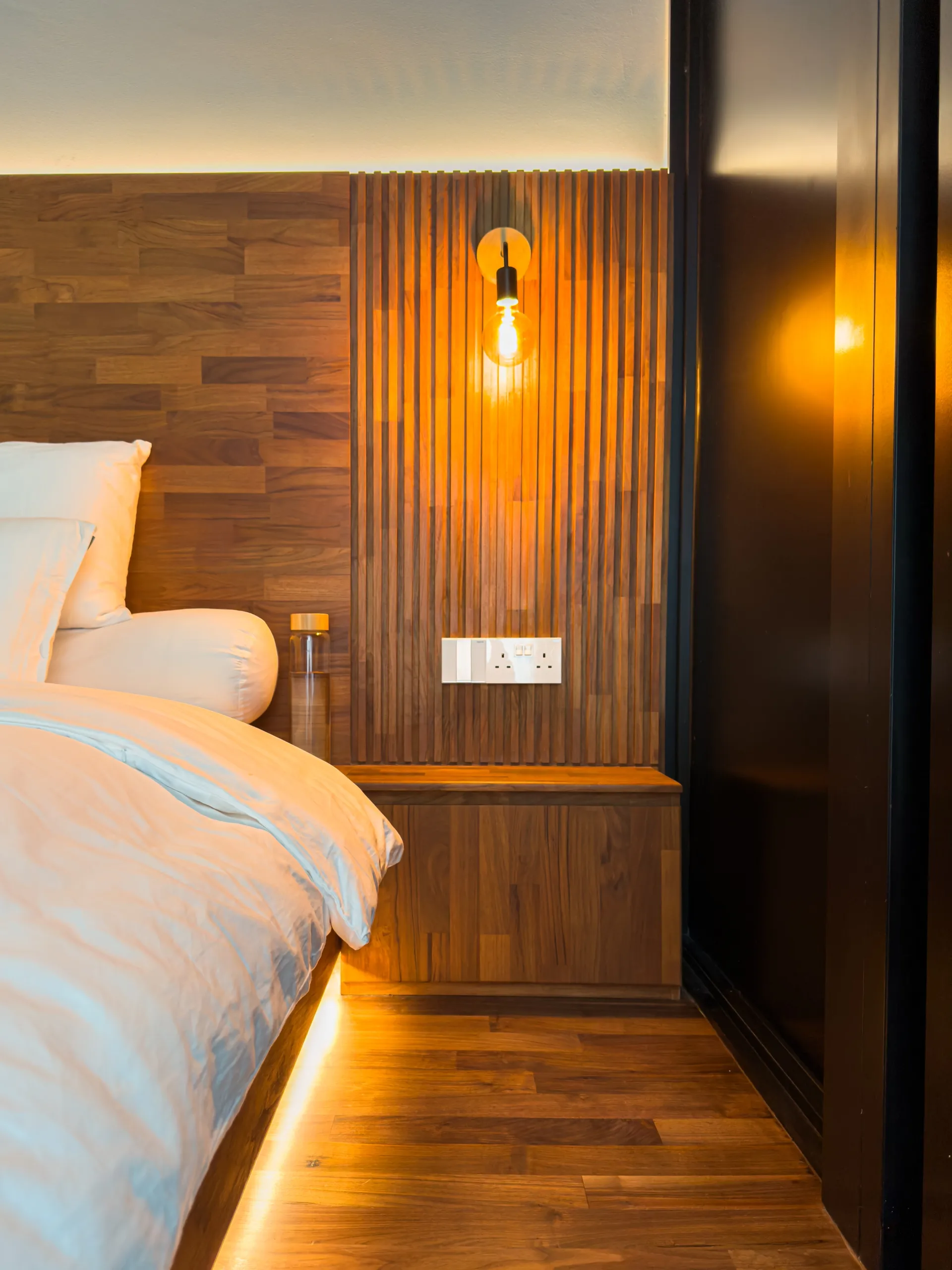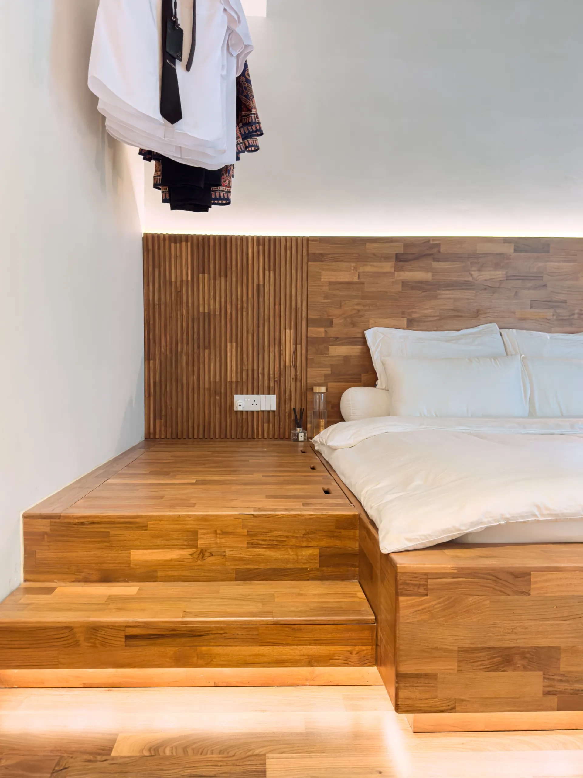 The feature ceiling sets the stage with its rich, golden hues, bringing natural warmth and sophistication. A custom-designed study table seamlessly blends functionality and style, while the teak platform bed adds a touch of luxurious comfort. Together, these elements create a cohesive space that showcases the timeless beauty and durability of teak wood.