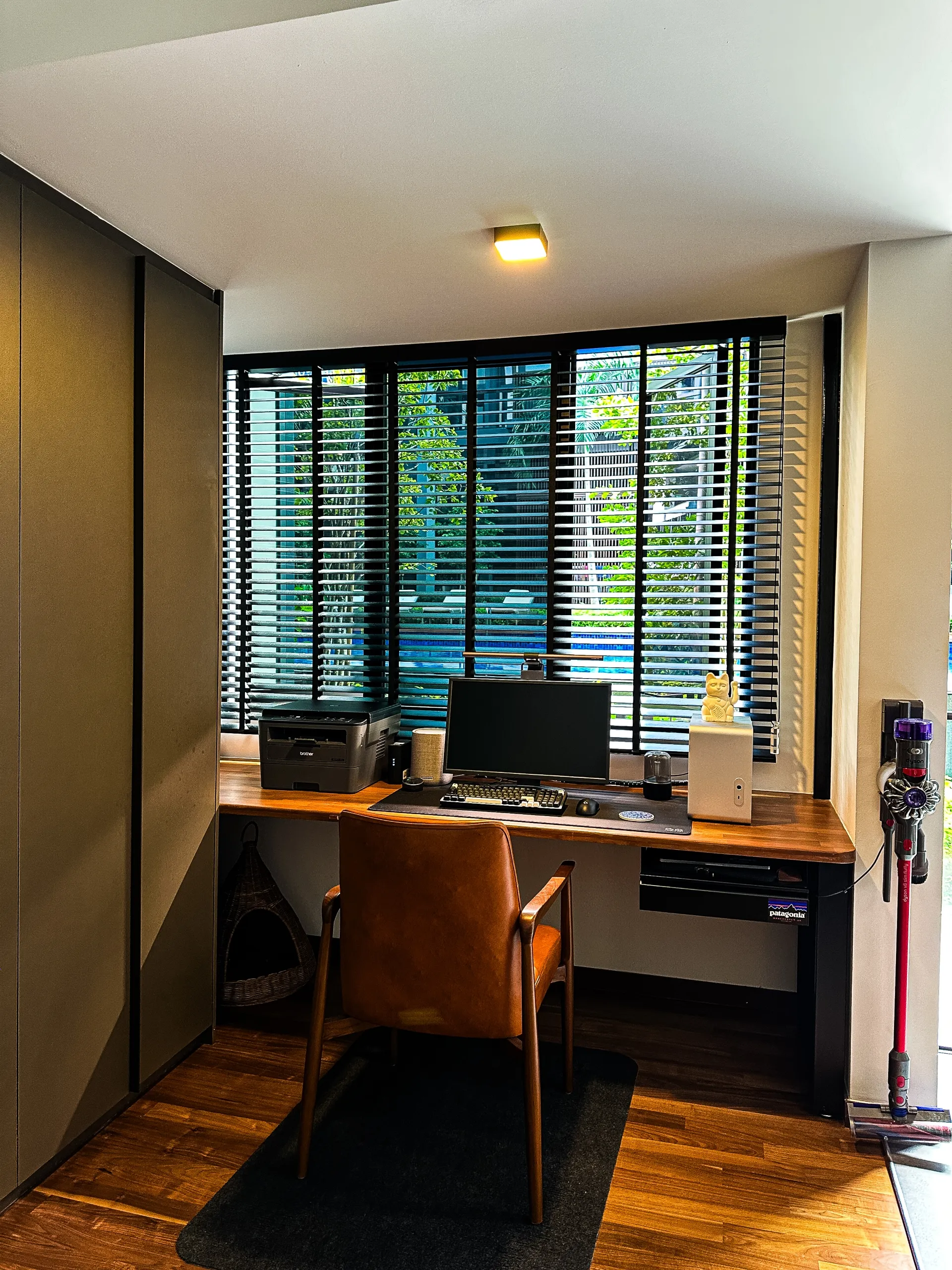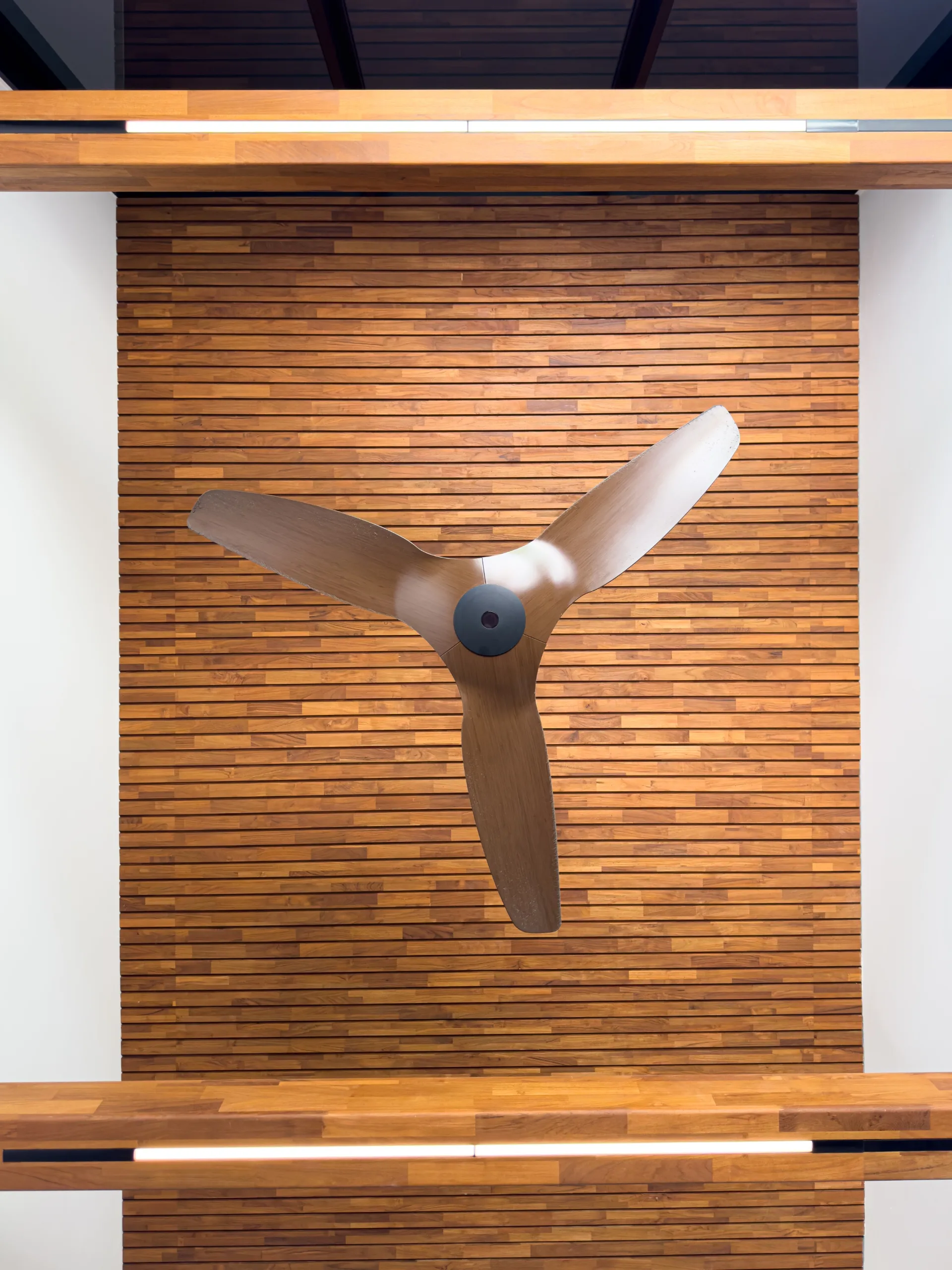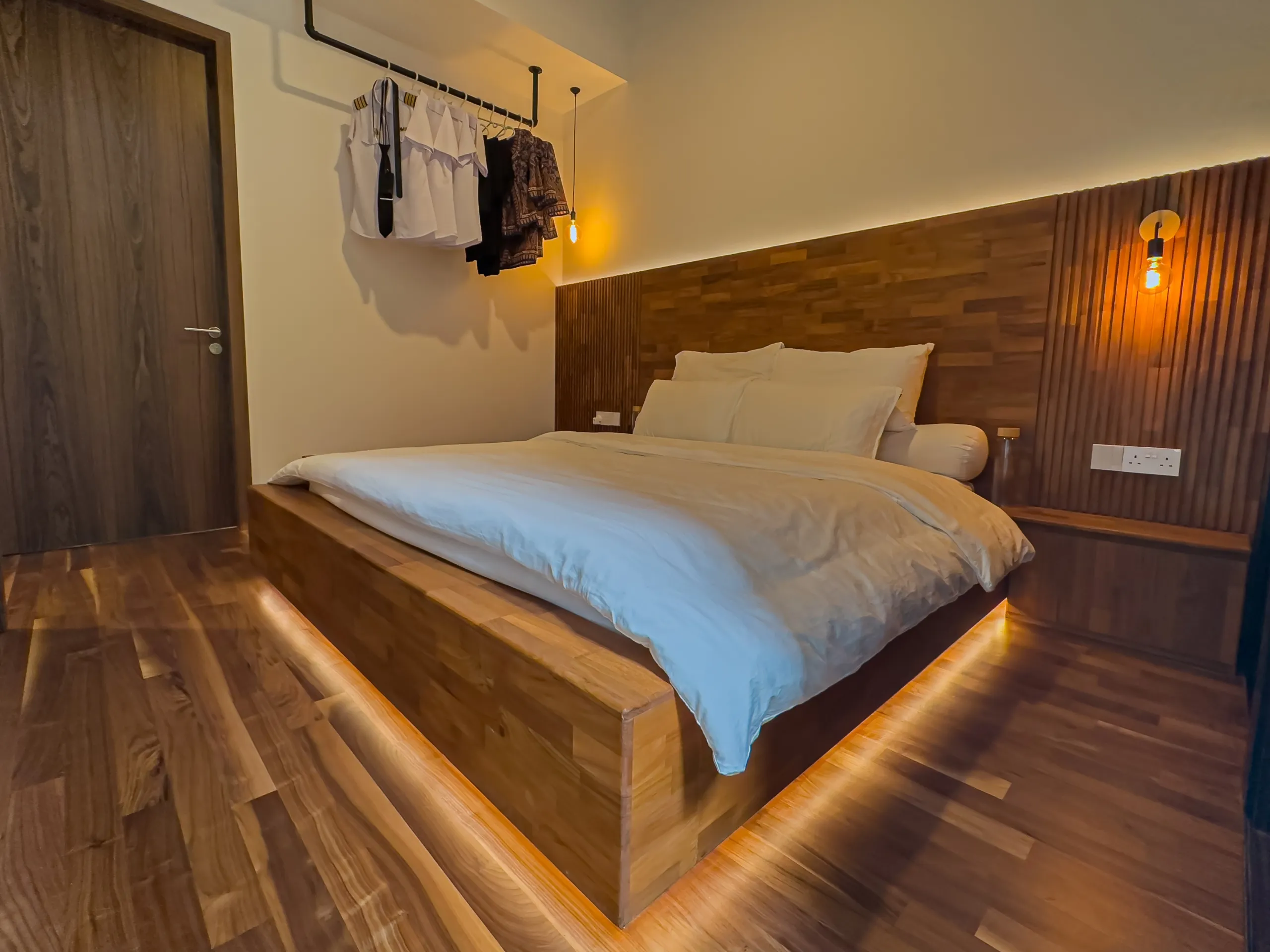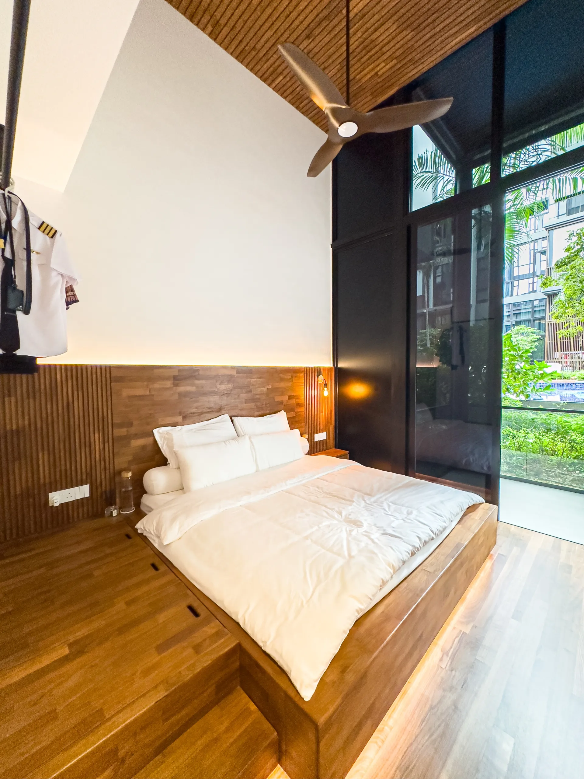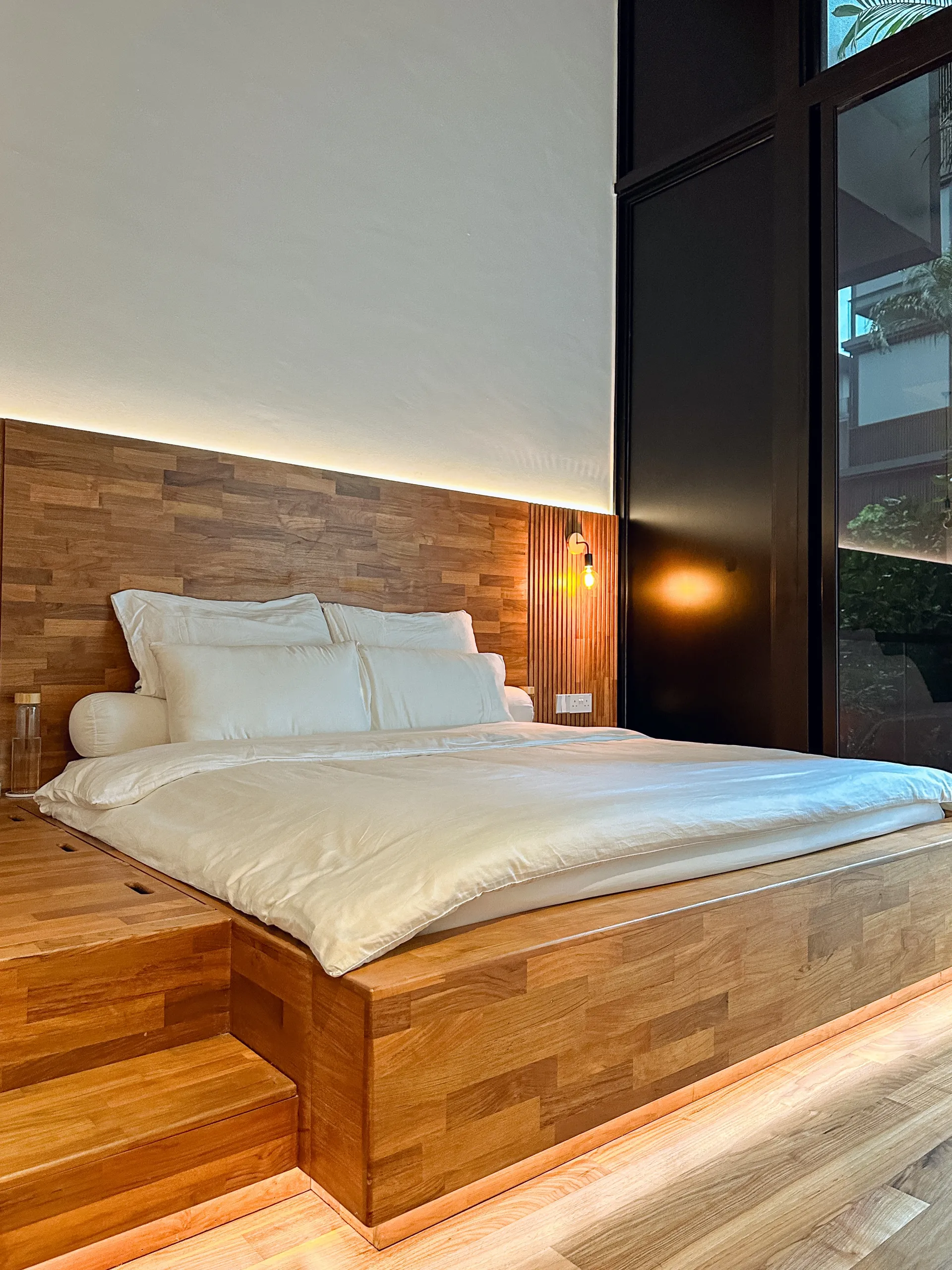 The feature ceiling sets the stage with its rich, golden hues, bringing natural warmth and sophistication. A custom-designed study table seamlessly blends functionality and style, while the teak platform bed adds a touch of luxurious comfort. Together, these elements create a cohesive space that showcases the timeless beauty and durability of teak wood.